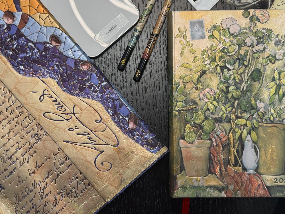To get through a busy day in the social world, Sandrine relies on her favourite Paperblanks essentials. Her Gaudi, The Manuscript of Reus journal, paired with a pen loop, is where she captures her ideas, meeting notes, and content plans. She keeps track of important dates and research in her journal, while her Jane Austen, Persuasion pencil case holds her Paperblanks pencils and keeps her desk organized.