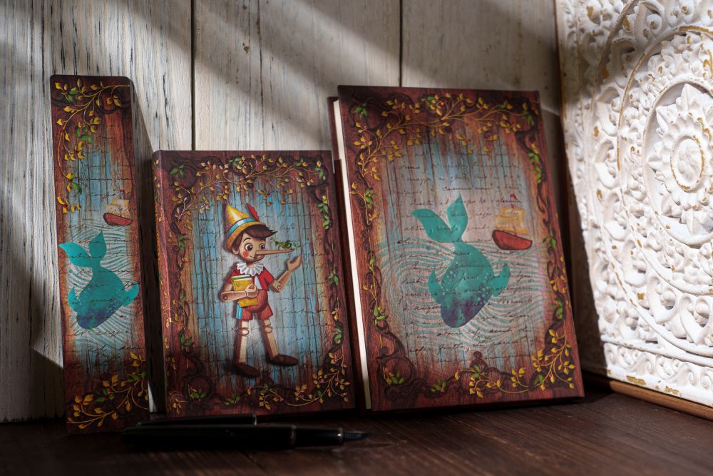 Following the warm reception of The Brothers Grimm, Frog Prince, we knew we wanted to create another design that captured the same sense of childlike wonder our community embraced so wholeheartedly. Pinocchio’s timeless story felt like the perfect choice. A particularly special detail of this design is the illustration layered over the handwritten manuscript page, created in-house by our talented graphic artists; showcasing the creativity and craftsmanship that defines every Paperblanks release.