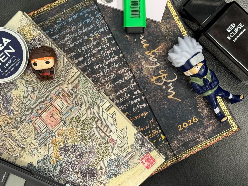 To help him through a busy day of planning and forecasting, Manas keeps two trusted Paperblanks products by his side. First is his 2026 12-month planner, which helps him organize his daily schedule. He uses it to track when items are expected to arrive at our international warehouses, take notes during meetings, and jot down quick reminders. His current design is Michelangelo, Handwriting in ultra size, which he finds perfect for his daily routine. As he explains, “The verso interior is perfect because it has the dates on one side and space for notes on the other, which works really well for how I plan my days.”